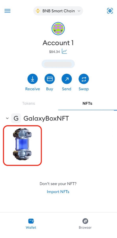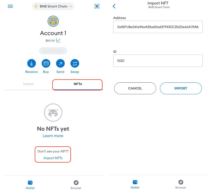 In the wallet, go to the **"NFTs"** tab and tap **"Import NFTs"**.