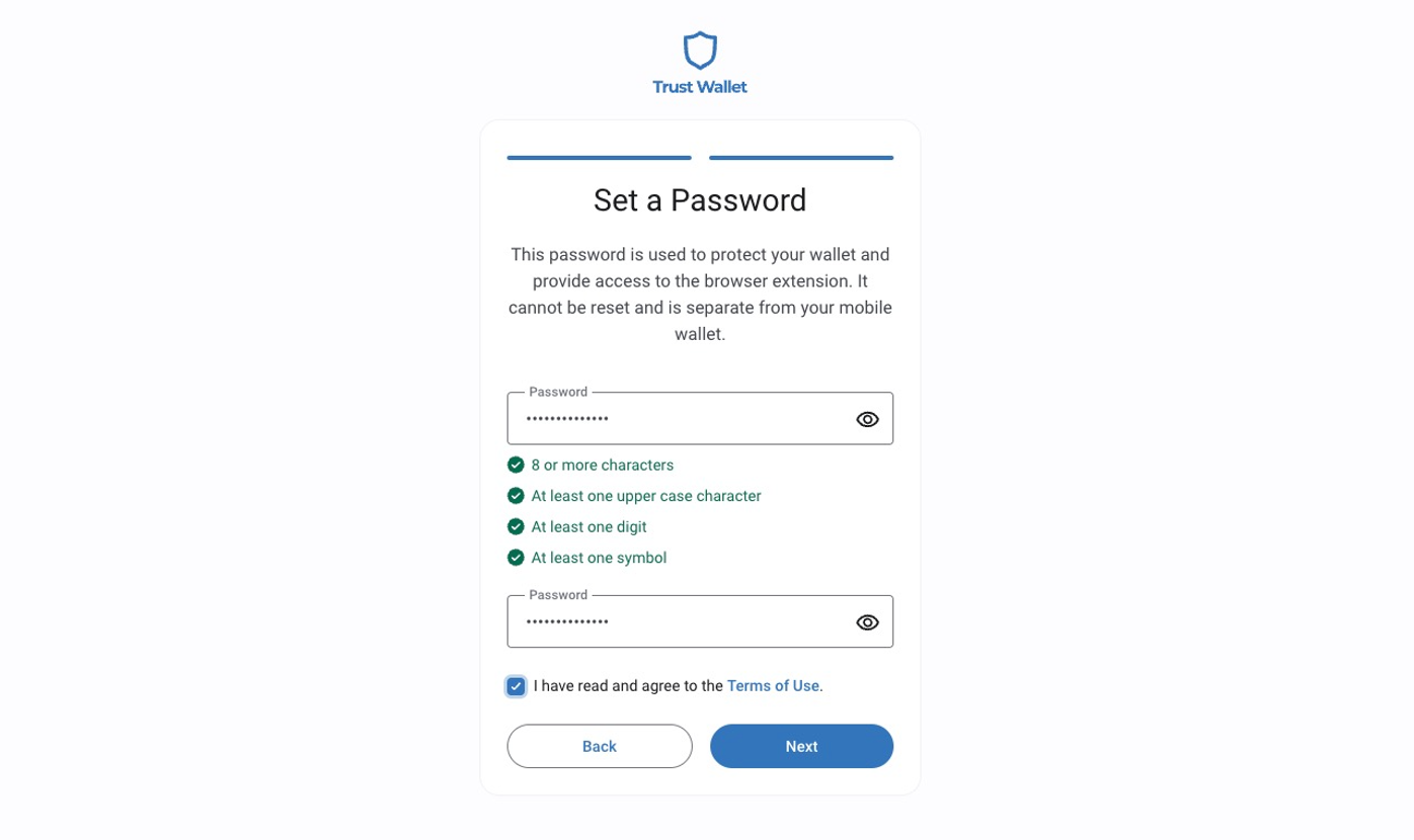 Repeat the password on the second line, read the rules for using the wallet and check the box next to **"I have read and agree to the Terms of Use",** then click&#x20;
