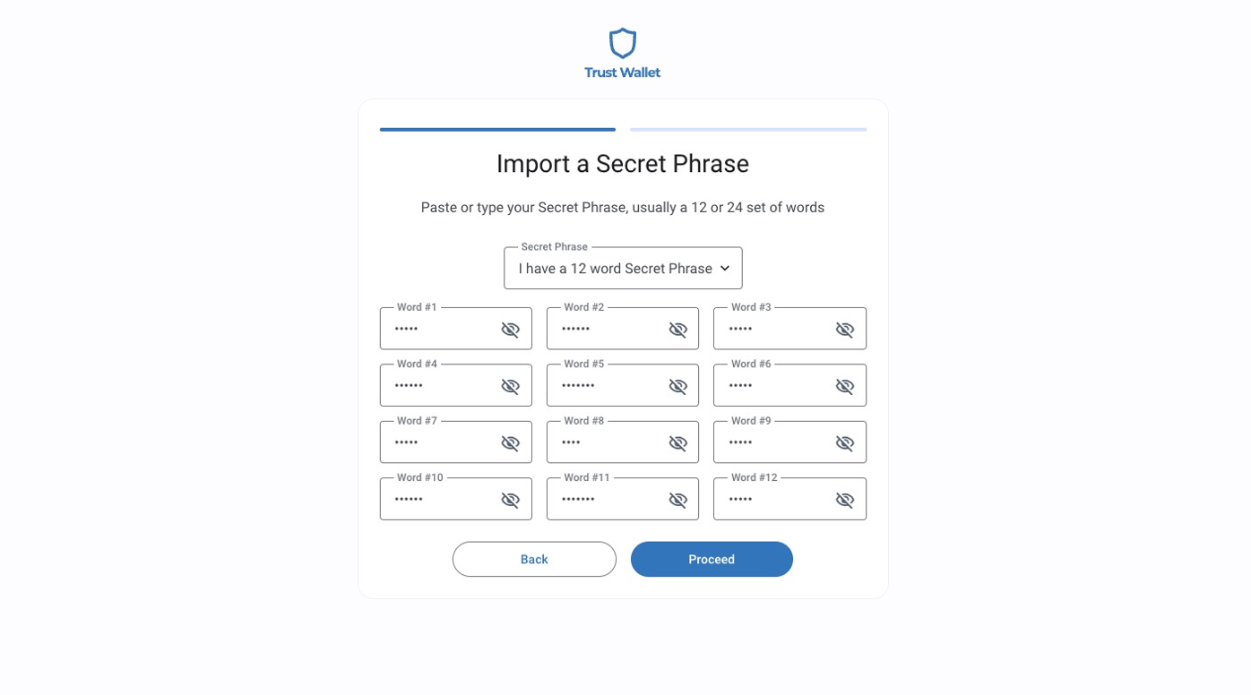 Enter the secret wallet phrase — all the words in the order in which they were previously written when you created the wallet. Click **Proceed** to continue.