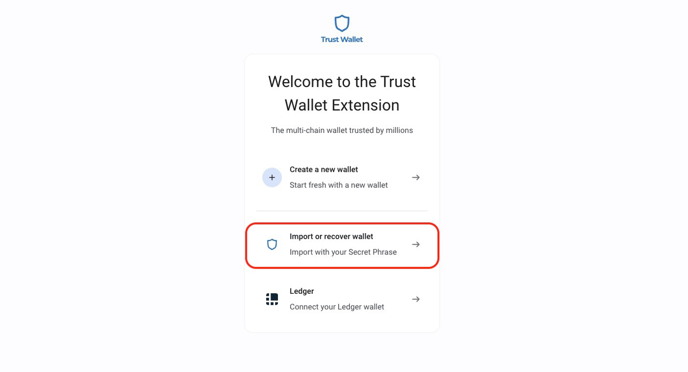 To import a wallet at the stage of creating a wallet, click **"Import or recover wallet"**.